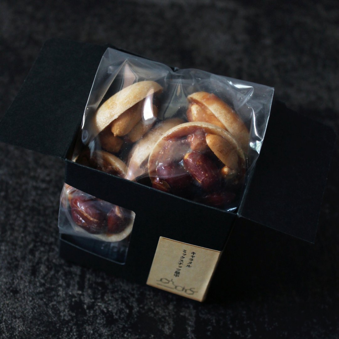 さくさくとした香ばしい最中にカシューナッツ・くるみ・アーモンド・ピーナッツの4種のナッツを丸ごと一粒ずつ丁寧に詰め、濃厚なキャラメルソースをかけて焼き上げました。