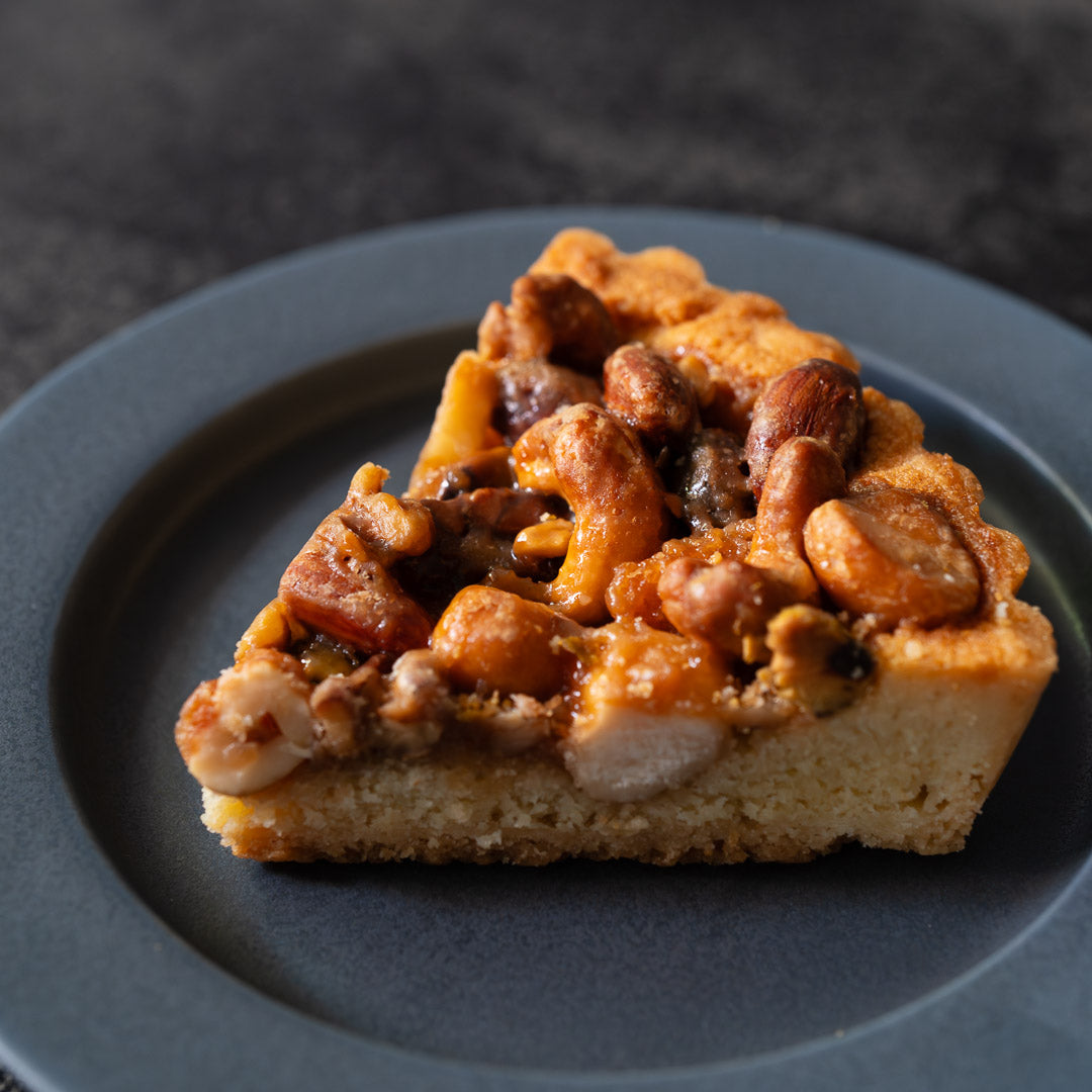 マカダミアナッツ、ヘーゼルナッツ、アーモンド、ピスタチオ、くるみ、カシュ―ナッツ 6種類のナッツをたっぷり使って焼き上げたタルト。