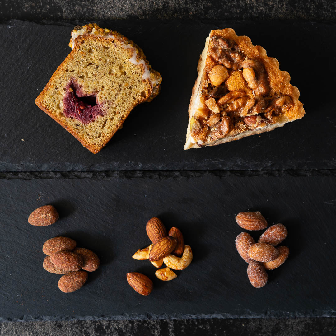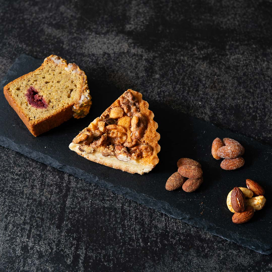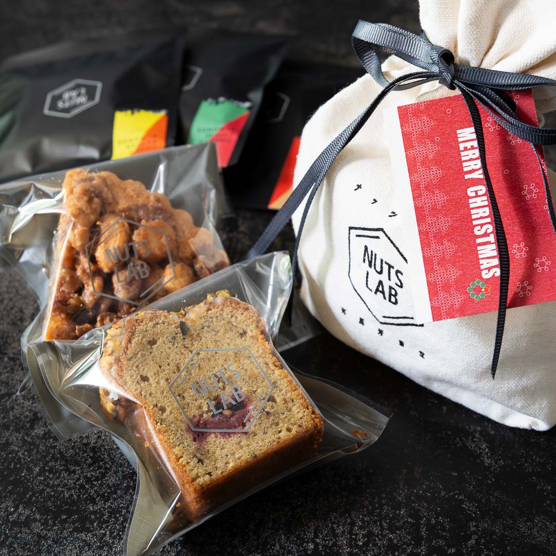 6種ナッツの香ばしいナッツタルト、ピスタチオを贅沢に使ったパウンドケーキ、そして濃厚・香ばしさ・甘じょっぱさと、さまざまな表情のナッツ3種を詰め込んだ、クリスマス限定の巾着ギフトです。